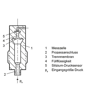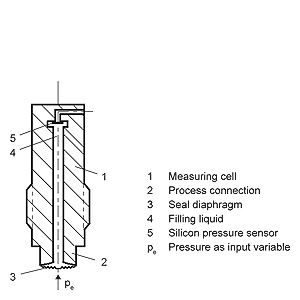 The pressure pe is applied through the process connection (2, Figure "Measuring cell for gage pressure, with front-flush diaphragm for paper industry, function diagram") to the measuring cell (1). This pressure is subsequently transmitted further through the seal diaphragm (3) and the filling liquid (4) to the silicon pressure sensor (5) whose measuring diaphragm is then flexed. This changes the resistance of the four piezo-resistors fitted in the diaphragm in a bridge circuit. This change in resistance results in a bridge output voltage proportional to the input pressure.