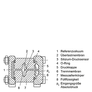 An overload diaphragm is installed to provide protection from overloads. If the measuring limits are exceeded, the overload diaphragm (2) is flexed until the seal diaphragm rests on the body of the measuring cell (7), thus protecting the silicon pressure sensor from overloads.