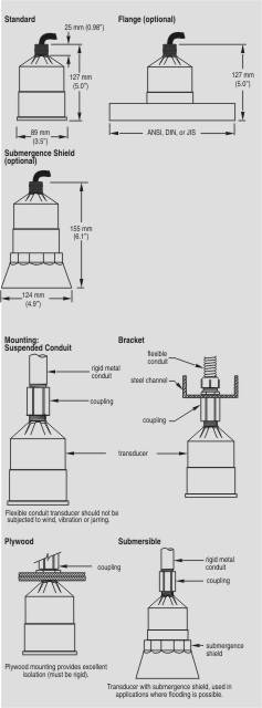 Технические данные Принцип работы | | Принцип измерения | Ультразвуковой сенсор | Вход | | Диапазон измерения | Тип. 0,3 до 8 м (1 до 26 ft), в зависимости от приложения | Выход | | Частота | 44 кГц | Ультразвуковой конус | 10° | Точность | | Температурная погрешность | Компенсируется встроенным температурным зондом | Рабочие условия | | Давление в резервуаре | Обычное давление воздуха | Внешние условия | | | -20 до +65 °C (-5 до +149° F) | Класс защиты | IP68 | Конструктивные особенности | | Вес (Приблизительный вес сенсора с кабелем стандартной длины.) | 1.2 кг (2.6 lbs) | Supply sources | Siemens Milltronics certified transmitter | Материал (корпус) | Kynar Flex enclosure and Hypalon face | Монтаж | 1“ NPT или 1“ BSP подключение к процессу | Signal transmission | 2-жильная скрученная экранированная пара, 0.5 мм2 (20 AWG), оболочка PVC | Кабель (макс. длина) | - 365 м (1200 ft.) с коаксиальным кабелем RG 62 A/U