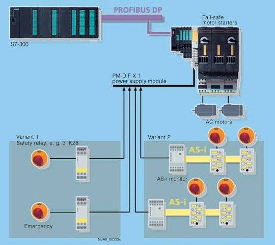 Дизайн Высокая гибкость в технике безопасности Пускатель повышенной безопасности Failsafe PROFISAFE: при использовании в EMERGENCY-STOP пускатели выборочно выключаются через модуль контроля питания PM-DF. Для каждого модуля контроля мощности может быть сформировано шесть отключаемых групп. Отказоустойчивые, свободнокоммутируемые контакторы Simatic обеспечивают связь с помощью интерфейса с соответствующими датчиками Failsafe. Интерфейс между PROFIsafe и обычными системами безопасности реализуется через Failsafe контактный множитель F-CM с четырьмя контактами. Пускатель Failsafe с реле безопасности (вариант 1) или AS-интерфейс Safety at Work (вариант 2): с помощью контура деблокирования монитора интерфейса AS-i Safety или защитного реле, ориентированные на защиту сигналы через клеммник модуля контроля питания PM-D F X1 попадают в ET 200S и тем самым воздействуют на пускатели Failsafe, которые производят селективное отключение двигателей. Пускатель повышенной безопасности Failsafe с AS-i Safety at Work и 3TK28 |
