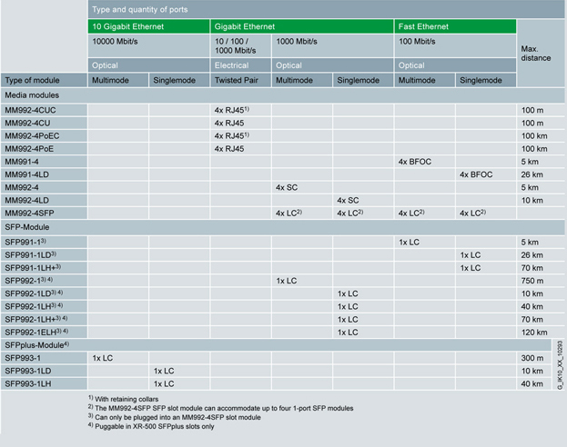 Съемные приемопередатчики SFP (Small Form-factor Pluggable) могут устанавливаться в интерфейсный субмодуль MM992-4SFP или во встроенные слоты SFP+ базового блока коммутатора SCALANCE X-500.