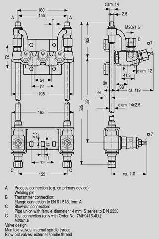 ДизайнКомбинация вентильных блоков DN 8 имеет одно подключение к процессу с приварной цапфой. Соединение для измерительного преобразователя давления выполнено как фланцевое соединение, продувочное соединение - как трубное резьбовое соединение с накидным кольцом. Вентили блока имеют внутреннюю ходовую резьбу, продувочные вентили - наружную ходовую резьбу. Опционными контрольными соединениями являются M20x1,5. Комбинация вентильных блоков DN 8 поставляется с монтажной панелью. Используемые материалы