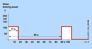 Средняя мощность торможения определяется, как указано ниже: Средняя мощность торможения = 110 kW x 17 s / 90 s = 20.78 kW P 20 = 4.5 x 20.78 kW = 93.5 kW Максимальная мощность = 0.8 x 110 kW = 88 kW Результат: развиваемая максимальная мощность имеет решающее значение для компоновки тормозного блока и тормозного сопротивления, т.е. нужно предусматривать тормозной блок и соответственно тормозное сопротивление ≥ 93,5 кВт.