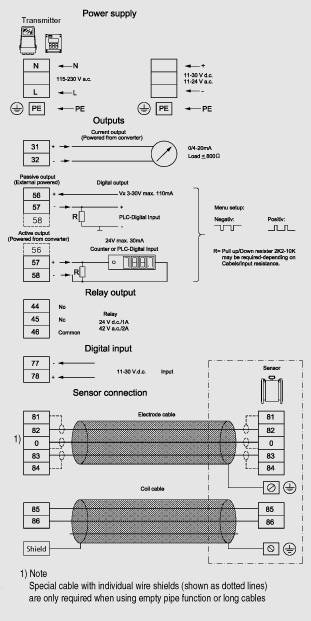 Схема подключенияЭлектрическое соединение Заземление PE требуется из - питания класса защиты 1. Механический счетчик Если к соединениям 57 и 58 подключается механический счетчик (активный выход ), то необходимо подключить конденсатор 1000 µF к соединениям 56 и 58; плюсовой полюс к соединению 56 и минусовой полюс к соединению 58. Выходной кабель Если используется длинный кабель и возмож ы помехи , то рекомендуется использовать экранированный кабель . |