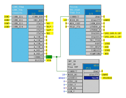 В функциональных блоках SIMATIC PCS 7, теги Triconex адресуются напрямую, через Triconex Alias . Это упрощает конфигурирование с помощником SIMATIC PCS 7, при вводе в эксплуатацию. Используя интегрированные функции симуляции, конфигурация SIMATIC PCS 7 может быть протестирована без безопасного контроллера.