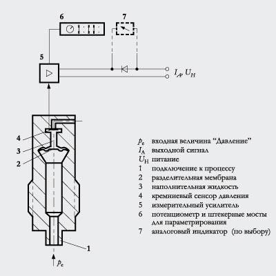 ФункцииПринцип работыДавление через разделительную мембрану (2, рис. Схема работы) и наполнительную жидкость (3) передается на кремневый сенсор давления (4) и отклоняет его мембрану. При этом четыре установленных на измерительную мембрану по мостовой схеме пьезо-сопротивления меняют тем самым величину сопротивления. Данное изменение сопротивления вызывает мостовое выходное напряжение, пропорциональное входному давлению, которое усиливается в измерительном усилителе (5) и преобразуется в выходной ток 4 до 20 мА. Измерительные преобразователи давления с интервалами измерения ≤ 63 bar измеряют входное давление по отношению к атмосферному, измерительные преобразователи давления с интервалом измерения 160 бар - по отношению к вакууму. Измерительный преобразователь давления SITRANS P, серия MK II, схема работы ПараметрированиеПараметрирование осуществляется через потенциометр и штепсельные мосты (6, рис. “Схема работы”). Следующие параметры могут устанавливаться и индицироваться: