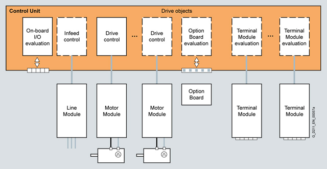 Функции приводов SINAMICS S120 хранятся на карте CompactFlash. На этой карте хранятся микропрограмма и настройки параметров для всех приводов в форме проекта. На карте CompactFlash также могут храниться дополнительные проекты, что означает, что доступ к текущему проекту может быть получен немедленно при вводе в эксплуатацию определенного количества устройств различных типов. При загрузке блока управления данные на карте CompactFlash считываются и загружаются в ОЗУ.Микропрограмма разделена на объекты. Объекты привода используются для реализации функций контроля по обратной/прямой связи для линейных модулей, модулей двигателя, модулей питания и других компонентов системы, подключенных к DRIVE-CLiQ.