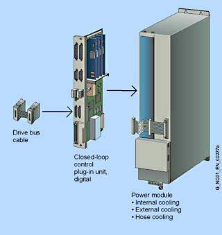Конструкция модулей приводов (здесь силовой модуль с внутренним теплоотводом) Модули приводов линейки приводов SIMODRIVE 611, в зависимости от использования, комплектуются в качестве привода двигателя подачи, привода двигателя главного движения или привода асинхронного двигателя из следующих компонентов: силовой модуль, блок управления, кабель шины привода и при необходимости опционные модули. При вставке блока управления в силовой модуль получается модуль привода, к примеру, для использования в качестве привода подачи или привода главного движения. В зависимости от вида теплоотвода выбираются расширенные, согласованные с системой блоки вентиляторов и компоненты воздуховодов. Благодаря модульной конструкции модулей приводов с помощью небольшого количества отдельных компонентов можно управлять множеством приложений пользователя. Указание: Для успешной и надежной работы системы приводов использовать только оригинальные компоненты системы SIMODRIVE в комбинации с описанными в этом каталоге и в руководствах по проектированию, описаниях функций и руководствах пользователя оригинальными принадлежностями Siemens. Пользователь должен учитывать параметры проектирования. Для отличных от указанных комбинаций (возможно и вместе с продуктами иных изготовителей) требуется отдельная договорная регламентация. При составлении модуля привода учитывать правила EGB (см. руководство по проектированию).