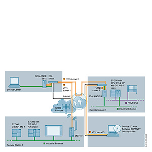 - Защищенный удаленный доступ через Интернет. Например, в сочетании с программным обеспечением "SOFTNET Security Client" и GPRS маршрутизатором MD741-1 или UMTS маршрутизатором SCALANCE M875.