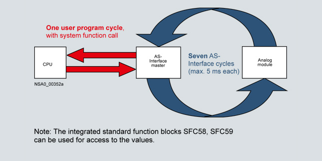 В случае опроса модуля ввода аналоговых сигналов результат аналого-цифрового преобразования накапливается в ведущем устройстве. Формирование окончательного значения измеренной аналоговой величины выполняет ведущее устройство AS-Interface.