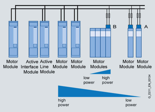 Если поперечное сечение кабелей шин сети DC снижается, для защиты от короткого замыкания должно использоваться плечо. Механизм ограничения тока модулей двигателя, подключённых к плечу с меньшей площадью сечения, защищает их от перегрузки. Не рекомендуется снижать площадь сечения шин и кабелей до минимальных рекомендуемых величин. Не требуется дополнительной защиты от перегрузок (предохранитель), если подразумевается, что перегрузка не может возникнуть из-за повреждения кабеля, подходящего к модулю двигателя, а плечо схемы защищено от перегрузок самим модулем двигателя.