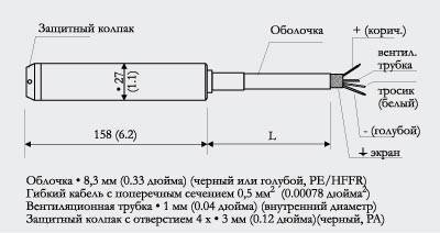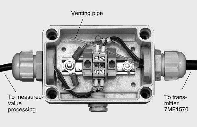 Функции Измерительный преобразователь давления SITRANS P, серия MPS, принцип работы и схема соединения Измерительный преобразователь давления SITRANS P, серия MPS, измеряет уровень жидкости в водохранилищах, резервуарах, каналах и платинах. На одной стороне датчика на мембрану воздействует гидростатическое давление, пропорциональное глубине погружения. Это давление сравнивается с атмосферным давлением. Выравнивание давлений осуществляется через находящуюся на соединительном кабеле вентиляционную трубку. Выходной сигнал напряжения датчика подается на электронику, где он преобразуется в выходной сигнал тока от 4 до 20 мА. Соединительный кабель измерительного преобразователя 7MF1570 всегда должен быть подключен к прилагаемой ответвительная коробке для кабеля. Ответвительная коробка для кабеля должна быть установлена вблизи от места измерения. |