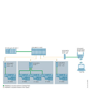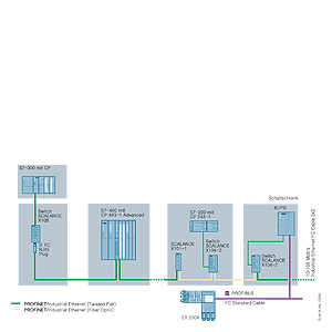 В типовом варианте конверторы SCALANCE X-100 размещаются в одном шкафу управления с подключаемым сетевым узлом. Они могут включаться в линейные, звездообразные и кольцевые сетевые структуры.