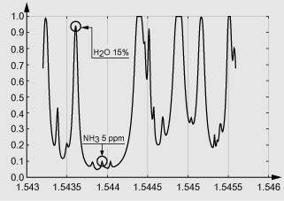 Функции Working principle LDS 6 is a gas analyzer employing single-line molecular absorption spectroscopy. A diode laser emits a beam of near-infrared light, which is sent through the process gas and detected by a receiver unit. The wavelength of the laser diode output is tuned to a gas specific absorption line. The laser is scanning continuously over this single absorption line with very high spectral resolution. The result is a fully resolved single molecular line which is analysed in terms of absorption strengths and line shape. The measurement is free of cross-interferences, since the quasi-monochromatic laser light is absorbed very selectively by only one specific molecular line in the scanned spectral range. Basic design of the LDS 6 LDS 6 is connected to a measuring point by fiber optics. The laser light is guided by a single mode fibre from the central unit to the transmitter unit of the in-situ sensor. The sensor consists of a transmitter and a receiver; their distance defines the measurement path. In the receiver box, the light is focused onto a suitable detector. The detector signal is then transferred into an optical signal and is transmitted via a second optical fibre to the central unit, where the concentration of the gas component is determined from the detected absorption signal. LDS 6 measures normally a single gas component. In some specific cases two components can be measured simultaneously, if their absorption lines are so close to each other that they can be detected within one laser scan (for example like water(H2O) and ammonia (NH3) in the spectrum shown. Absorption spectra of water and ammonia Moreover, in some applications it is possible to determine the gas temperature as a measurement value. In this case, the ratio of the absorbance of two characteristic lines of the same molecule measured at the same time in the same volume gives the actual temperature in the process gas. Typical measurable gases for LDS 6 are: - Oxygen / O2