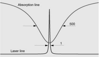 By using an internal reference cell normally filled with the gas measured, the stability of the spectrometer is permanently checked in a reference channel. By doing so, the continuous calibration of the instrument is guaranteed without the need of carrying out external re-calibrations by bottled test gases or reference cuvettes. Typical spectral width of an absorption line compared to the width of the laser emission Influences on the measurement - Dust load: As long as the laser beam is able to give a suitable detector signal, the dust load of the process gases does not influence the analytical result. By applying a dynamic background correction, measurements can be carried out without any negative impact. Typical particle densities from below 1 mg/Nm3 to 100 g/Nm3 can be handled by the LDS 6. The varying dust loads are compensated by scanning the laser over the gas absorption line and the inherent background. At a scan position next to the absorption line, the instrument can "see" only absorption caused by the dust load where at the line center the signal is composed of the molecular absorption and the continuous, unspecific background absorption. While using a wavelength modulation technique, the actual measured transmission is always compared with the baseline. In the signal processing, a lock-in detection scheme delivers a signal only from the molecular line free of background.