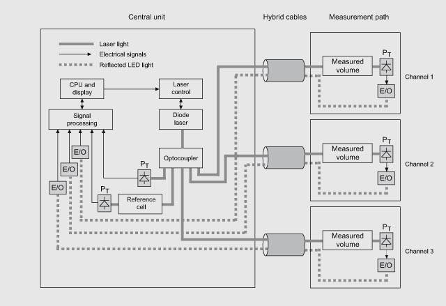 ДизайнLDS 6 consists of a central unit, accomplished by up to three pairs of cross duct sensors in a transmitter/receiver configuration. The connection between the central unit and the sensors is established by a so-called hybrid cable, which contains optical fibers and copper wires. An additional loop cable connects both sensor parts. Central unit The central unit is housed in a 19"-rack with 4 holders for assembly - in a swing gate