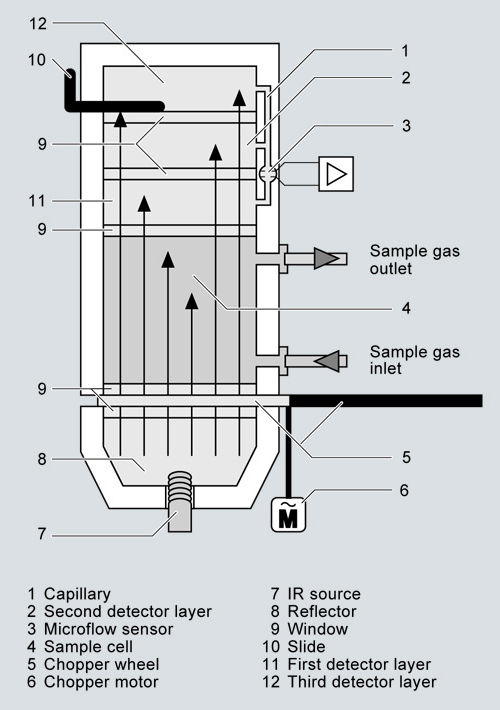 The represented detector is composed of layers filled with the component to be analyzed. The energy of the middles of the IR bands of the measured gases is mainly absorbed in the first layer. The second layer absorbs the edge energy which is tuned on high selectivity in the third layer via an aperture.