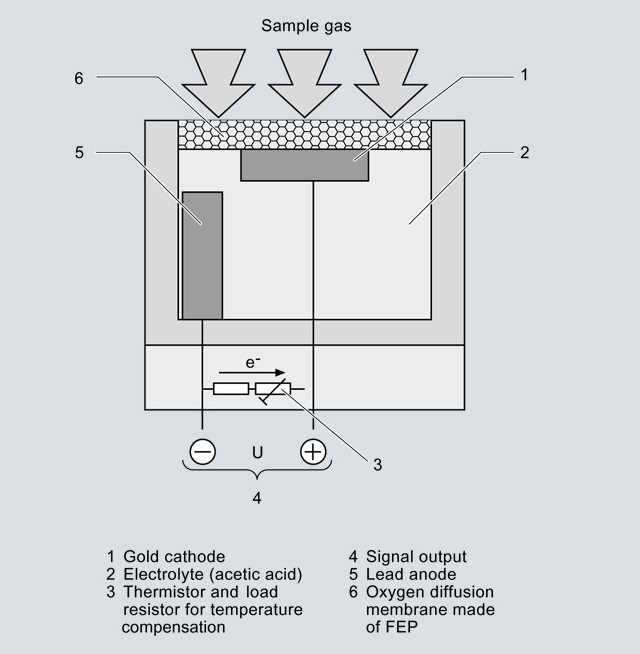 The oxygen sensor operates according to the principle of a fuel cell. The oxygen is converted at the boundary layer between cathode and electrolyte; the resulting current is proportional to the concentration of oxygen.