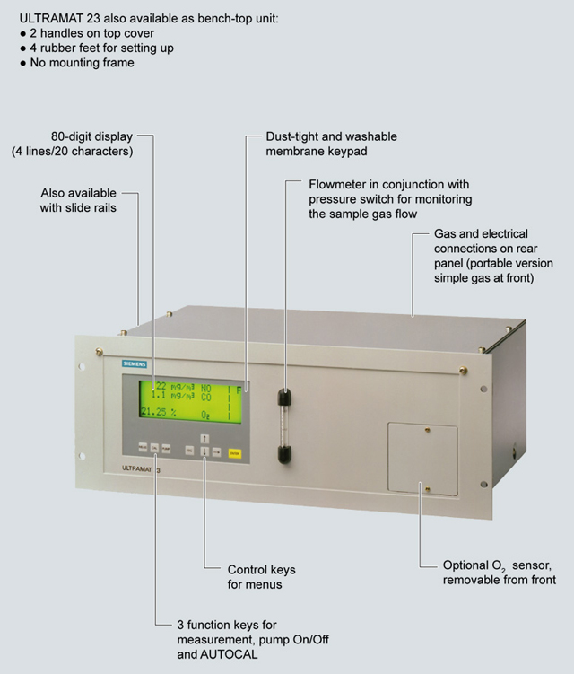 Газоанализатор ULTRAMAT 23 может измерять до 4 газовых компонентов одновременно: максимум три ИК-чувствительных газа, таких как CO, CО2, NO, SО2, CH4 плюс 02 с помощью электрохимической ячейки измерения кислорода.