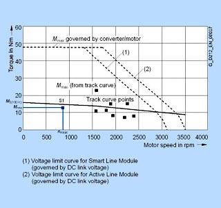 Среднеквадратический вращающий момент Mrms должен лежать ниже кривой S1. Максимальный вращающий момент Mmax достигается во время процесса ускорения и должен лежать ниже предельной кривой напряжения для синхронных двигателей и ниже предела устойчивости для асинхронных двигателей.