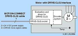 DRIVE-CLiQ является предпочтительным методом подключения датчика к SINAMICS S120.Можно использовать двигатели с интерфейсом DRIVE-CLiQ, например, синхронные двигатели 1FK7/1FT6, электродвигатель с большим пусковым моментом 1FW3 и асинхронные двигатели 1PH7, 1PL6 and 1PH4.Двигатели с интерфейсом DRIVE-CLiQ могут прямо подключаться на соответствующий Двигательный модуль при помощи кабеля MOTION-CONNECT DRIVE-CLiQ. Подключение кабеля MOTION-CONNECT DRIVE-CLiQ на двигатель имеет защиту класса IP67.Интерфейс DRIVE-CLiQ служит для подключения датчика двигателя через интегрированный источник питания 24 В DC и передачу сигналов датчика двигателя и температуры, а также сведения об электронной системе, например, уникальный серийный номер, номинальные значения (напряжение, сила тока, крутящий момент) на Блок управления. Это означает, что для датчиков разных видов - например, резольвер или абсолютный датчик – не требуются различные кабели различной длины, используется кабель одного вида - MOTION-CONNECT. DRIVE-CLiQ – для всех датчиков. Эти двигатели значительно облегчают ввод в эксплуатацию и диагностику, так как двигатель и тип датчика определяются автоматически.