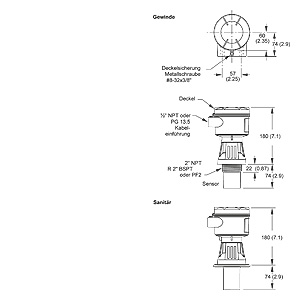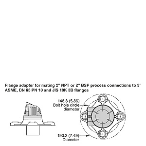 Имеется три типа резьб Pointek ULS 200 : 2" NPT, 2" BSP или PF2 . Сигнализатор предельного уровня может быть снабжен фланцевым адаптеромl 75 mm (3") в качестве ответного фланца к фланцамo 3" ANSI, DIN 65, PN10 и JIS 10K 3B.
