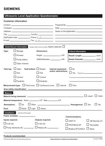 IntroductionUltrasonic measurement is based on the speed of sound. Sound can be used as a measurement tool because there is a measurable time lapse between sound generation and the "hearing" of the sound. This time lapse is then converted into usable information. Ultrasonic sensing equipment generates a sound above 20 000 Hz and then interprets the time lapse of the returned echo. The transducer creates the sound and senses the echo and then a transceiver interprets the sound and converts it into information. Siemens Milltronics ultrasonic units include Sonic Intelligence, a patented signal processing technology. Using unique algorithms, Sonic Intelligence differentiates between true echoes from the material and false echoes from obstructions or electrical noise, providing intelligent processing of echo profiles. Typical SystemUltrasonic level measurement requires two components: one to generate the sound and catch the echo (transducer) and one to interpret the data and derive a measurement (transceiver). Even though some ultrasonic instruments combine the components in one unit, the individual functionality remains distinct. The measurement output is communicated to the unit, PLCs or PCs for process control. Principle of OperationA piezoelectric crystal inside the transducer converts an electrical signal into sound energy, firing a burst into the air which travels to the target, and then is reflected back to the transducer. The transducer then acts as a receiving device and converts the sonic energy back into an electrical signal. An electronic signal processor analyzes the return echo and calculates the distance between the transducer and the target. The time lapse between firing the sound burst and receiving the return echo is directly proportional to the distance between the transducer and the material in the vessel. This basic principle lies at the heart of the ultrasonic measurement technology and is illustrated in the equation: Distance = (Velocity of Sound x Time) / 2. | |||||||||||||||||||||||||||||||||||||||||||||||||