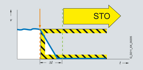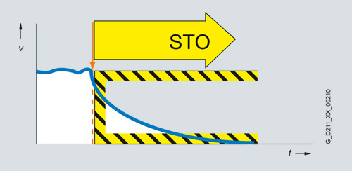 Безопасное отключение момента вращения (STO) | Описание функции Это функция предотвращает внезапный перезапуск привода в соответствии с EN 60204-1, пункт 5.4. Безопасное отключение вращающего момента запрещает импульсы управления ключами и оключает источник питания двигателя. В приводе нет момента вращения. Это состояние контролируется в самом приводе. Преимущества для заказчика STO имеет мгновенный эффект таким образом, что привод не может вырабатывать больше энергии для момента вращения. STO может быть использован не зависимо от того, придет ли привод в состояние покоя в значительно короткое время имея нагрузку или вращение привода по инерции не будет иметь такого большого значения для безопасности. |