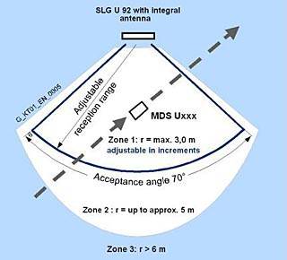 УказанияПодробную информацию (расстояние от металла, расстояние между SLG и т.д.) можно найти в "MOBY U Manual for Configuration, Assembly and Service [Руководство по конфигурированию, сборке и обслуживанию MOBYU]“. Эксплуатационные характеристики (экономичный режим работы батареи)В отличие от индуктивных идентификационных систем, работающих на радиочастотах (RFID-систем), системы, работающие в диапазоне сверхвысоких частот (УВЧ), демонстрируют при передаче поведение, подобное электромагнитным волнам. Длина волны составляет около 13 см. Металлические поверхности отражают эти волны, и они через эти поверхности не проникают. Несмотря на низкую мощность излучения УВЧ-системы имеют относительно большое рабочее расстояние. Излучаемое поле имеет диаграмму направленности, которая зависит от конструкции антенны. Чтобы поддерживать низкие энергетические потребности MDS и обеспечить удобство определения местоположения, MOBY U имеет различные функциональные зоны, которые зависят от направления и расстояния. Эти три различных зоны передающего поля идентифицируются различными состояниями и реакциями затронутых компонентов. Циклический режим MDS U589 при температурах > 85 °CПри температурах до +85 °C в циклическом режиме нет необходимости, т.е. до этой температуры MDS может находиться в работе постоянно Пусть, например, зона 3 – это зона, свободная от поля SLG. MDS "спит" и только прислушивается каждые 0,5 с к наличию признаков жизни от SLG. Это означает очень низкое потребление энергии. Если другие пользователи УВЧ поблизости занимают тот же самый частотный диапазон, то это не оказывает влияния на MDS, так как для его пробуждения нужен специальный код. Если MDS, находящийся поблизости активного SLG, получает этот специальный код, он переходит в зону 2 (см. рисунок). Он немедленно принимает сигнал SLG и коротко отвечает своим собственным идентификатором. Однако SLG игнорирует любой MDS, если он не находится в зоне 1, параметр радиуса которой может быть установлен ступенями в SLG. Потребление энергии в зоне 2 незначительно выше, чем в зоне 3. Если MDS входит в зону 1, он надлежащим образом регистрируется SLG, и обмен данными может начинаться. Теперь могут выполняться все функции чтения и записи. Однако, так как скорость передачи у радиоинтерфейса очень велика (80 Кбит/с), общее время обмена данными очень мало. Например, все байты 32-килобайтной памяти считываются примерно за 8 секунд. Это значит, что обмен данными не создает большой нагрузки на батарею.