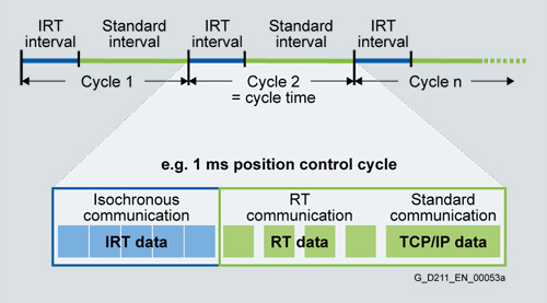 этом случае система контроля движений (например, SIMOTION) управляет или синхронизирует оси с использованием сети PROFINET. Для этого необходима циклическая астатичная передача данных между приводами. PROFINET IO с поддержкой соответствует этому требованию. Для этого цикл связи подразделен на различные каналы, связанные со временными параметрами. Первый канал используется для астатической связи в реальном времени (IRT), после чего используется связь в реальном времени (RT) и стандартная связь по TCP/IP. Путем конфигурирования этого приложения, т.е. синхронизации работы двух осей, IRT-сообщения определяются явно и генерируются соответствующие данные настройки.