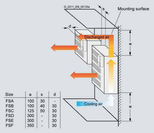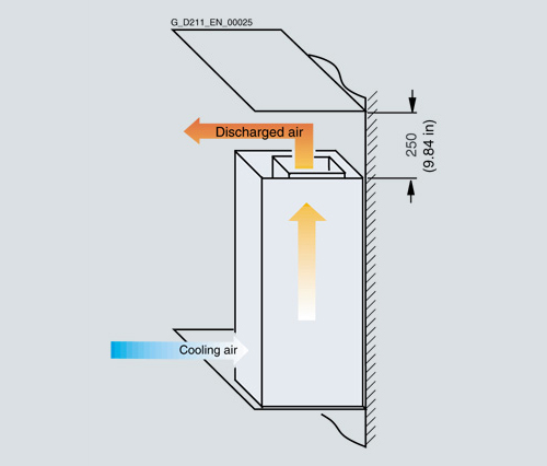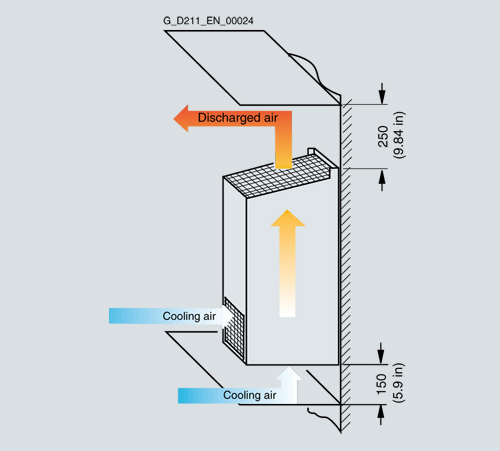 При установке на стену, сетевым дроселям и сетевым яильтрам требуется вентиляционное пространство 100 мм (3,94 дюйма)