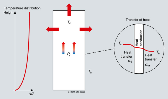 Передача тепла через стены шкафа управления определяется передачей тепла внутреннего воздуха стене шкафа, проведением тепла через стену шкафа и передачей тепла от стены шкафа во внешний воздух. Значение переданного тепла рассчитывается с учетом коэффициента переноса тепла α, и теплопроводности λ, а также толщины стены шкафа d. Таким образом, значение возможной потери тепла Pv рассчитывается следующим образом: Pv = [1/(1/αi + d/λ + 1/αa)] × A × Δϑ = k × A × Δϑ