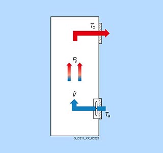 В шкафах управления с принудительным охлаждением, теплоотдача Pv идет через теплоотвод с возросшей температурой воздуха на Δϑ. За интервал времени Δt, воздух набирает тепло Q = c × m × Δϑ = Pv × Δt и проходит через шкаф управления (c является коэффициентом теплоемкости воздуха). Масса m и объем V связанны через плотность ρ.. m = ρ × V. Используя
