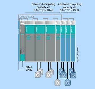 ДизайнРешения автоматизации с использованием нескольких осей можно реализовать с помощью расширения контроллера SIMOTION D и SIMOTION CX32, SIMOTION D может управлять и контролировать движения большого количества осей (до 64) и управляет приводами до 6 servo-осей, а также интегрированным питанием. Альтернативой являются векторные оси или V/f -оси. Контроль привода для до 6 дополнительных servo-осей может быть реализован с помощь расширения контроллера SIMOTION CX32, Для группы осей можно использовать более одного расширения контроллера SIMOTION CX32,