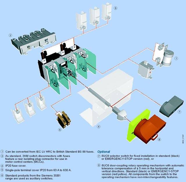 ДизайнВсе разъединители нагрузки конструктивно имеют двойное прерывание контактов и разрыв. Тем самым в состоянии ОТКЛ. предохранители разъединителя обесточены. Разъединители-предохранители 3KM дополнительно оснащаются планкой с разъединяющими контактами. Это облегчает монтаж и соединение в шкафах управления двигательными нагрузками (MCC) в сочетании с вертикальными сборными шинами. Как правило, все разъединители нагрузки SENTRON 3K. 5 с помощью навесного замка можно заблокировать от несанкционированного повторного включения. Унифицированные аксессуары к разъединителям с предохранителями и без них SENTRON 3KA, 3KL и 3KM упрощают ведение склада. Для использования в целлюлозно-бумажной промышленности по запросу поставляются также специальные исполнения с пониженными параметрами, особо устойчивые к условиям с большим содержанием серы. |