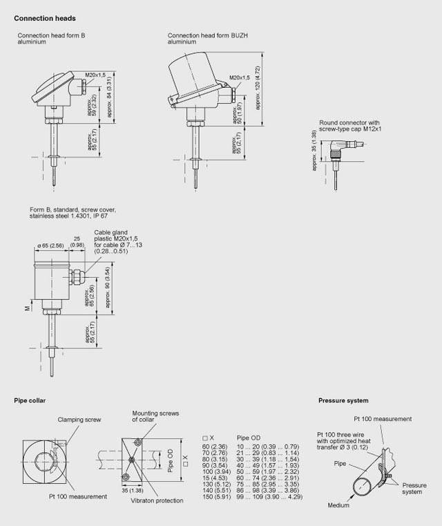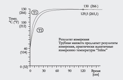 Принцип работыРегистрация температуры осуществляется с помощью измерительного элемента Pt 100. Для оптимальной теплопередачи между трубопроводом и Pt 100 установлена металлическая прижимная система. Измерительная вставка защищена изоляционной манжетой из температуростойкого пластика. При необходимости калибровки весь блок Pt 100 легко демонтируется; при этом не требуется отсоединять соединительную линию от измерительного зонда. Температурный зонд с трубной манжетой поставляется со всеми распространенными DIN-соединительными головками. Время отклика / точностьПример использования Измеряемое вещество: Водяной пар T1: Обычная приварная защитная трубка формы 2 по DIN 43772 (трубка 9 x 1 мм (от 0.35 до 0.04 дюймов)) T2: Трубная манжета для наружного диаметра трубы 25,4 мм (1 дюйм) по BS 4825 с измерительной вставкой (с быстрым откликом)