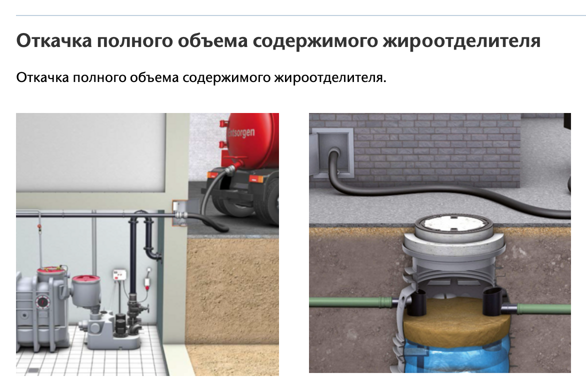 Жироотделители полной откачки устанавливаются там, где можно предусмотреть подход утилизационной машины к стене здания, на улице. Для проведения откачки, от корпуса жироотделителя, выводится напорная труба в, намеченное для доступа машины, место, в лючок на стене здания. В лючке, на напорную трубу, устанавливается муфта для подключения шланга утилизационной машины. Во время откачки удаляется весь объем содержимого отделителя и воды от промывки его корпуса. Приведение жироотделителя в рабочее состояние – это заполнение его чистой водопроводной водой перед началом эксплуатации. Во время откачки жироотделителя кухня предприятия не должна работать, т.е. стоки не должны поступать в жироотделитель.