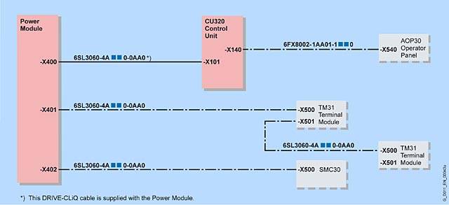 Коммуникация между блоком управления CU320, силовым модулем и другими активными компонентами SINAMICS происходит через DRIVE-CLiQ - внутренний последовательный интерфейс двигателя. Для этого доступны заранее смонтированные кабели.