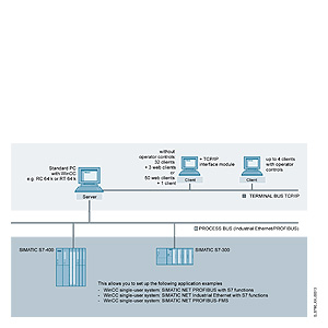 Коммуникации клиент-сервер осуществляются по протоколу TCP/IP. Рекомендуется построение отдельной сети ПК. В маленьких проектах с небольшим количеством телеграмм можно применять промышленную сеть SIMATIC NET Industrial Ethernet как для связи с процессом (WinCC/Server ↔ ПЛК), так и для связи между ПК (WinCC/Клиент ↔ WinCC/Сервер)