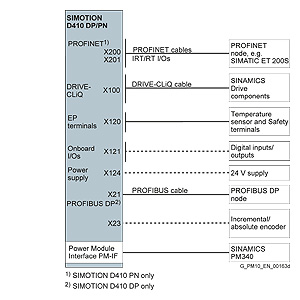 SIMOTION D410 это версия контроллера серии SIMOTION D, который может управлять одной осью. Существует две версии контроллера: с встроенным интерфейсом PROFIBUS (D410 DP) и с встроенным интерфейсом  PROFINET (D410 PN).     Контроллер SIMOTION D410 был разработан для использования совместно с силовым модулем PM340 SINAMICS (блочный формат).  SIMOTION D410 подключается на прямую к силовому модулю. Также SIMOTION D410 может быть установлен на специальную соединительную плату (плата заказывается отдельно). SIMOTION D410 имеет все функции управления движением для одной оси, управления технологическими объектами и функции ПЛК, также SIMOTION D410 способен управлять приводом соответствующей оси. В контроллер интегрированы входы/ выходы, из которых четыре являются быстрыми выходами для кулачков или трех измерительных щупов. Контроллер может управлять приводом в серворежиме (с датчиком или без датчика) для высоко динамичных применений или в векторном режиме для поддержания вращающего момента с высокой точностью.