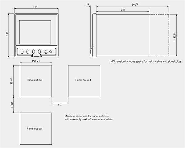 ДизайнThe SIREC DS has a housing for panel mounting. Front dimensions: 144 x 144 mm. The unit is operated and set using a short-stroke keypad on the front panel. The diskette drive for data storage is accessible by lifting up the keypad. The electric connections are made at the rear of the recorder: