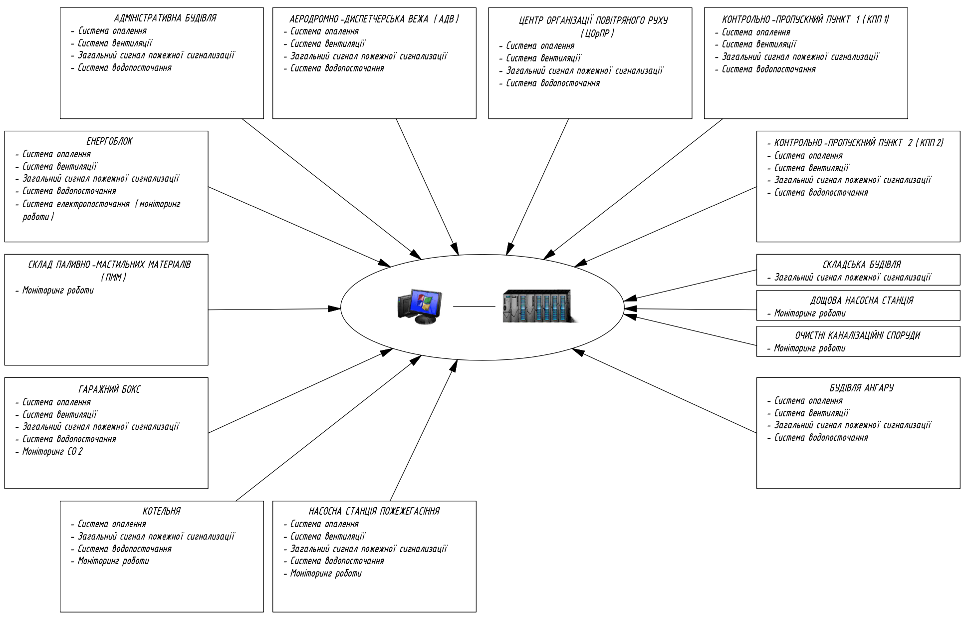 - Збір поточної інформації про стан та параметри систем життєзабезпечення комплексу будівель аеропорту;