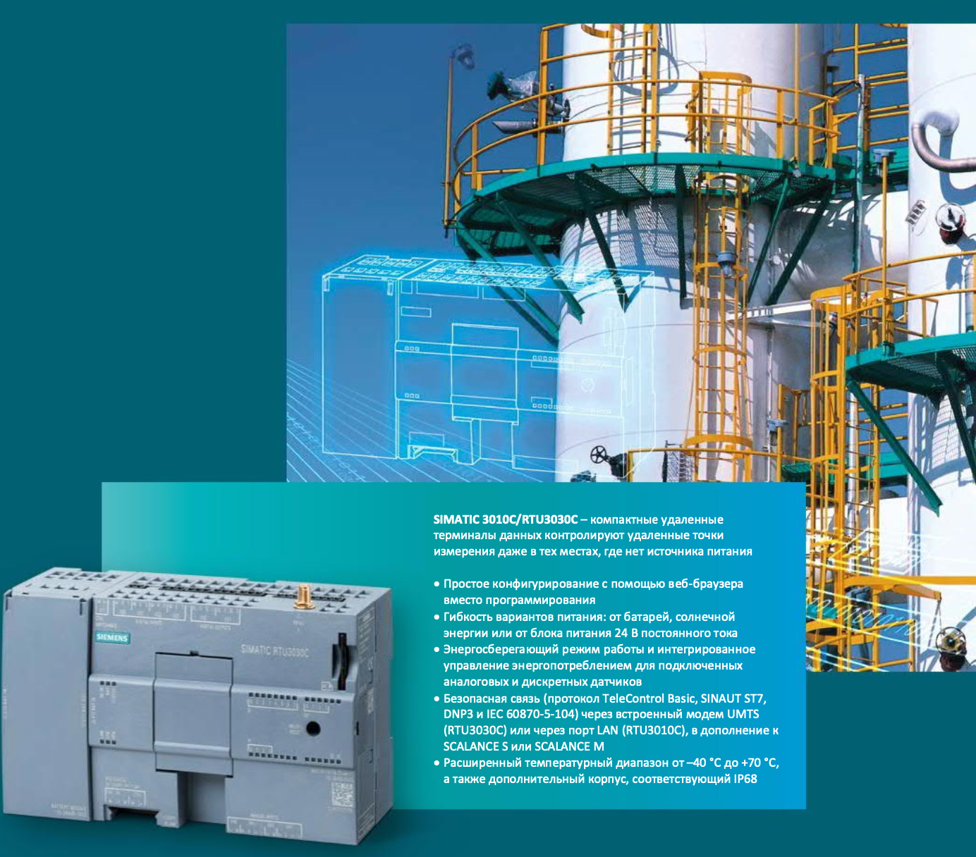 · Безопасная связь (протокол TeleControl Basic, SINAUT ST7, DNP3 и IEC 60870-5-104) через встроенный модем UMTS (RTU3030C) или через порт LAN (RTU3010C), в дополнение кSCALANCE S или SCALANCE M