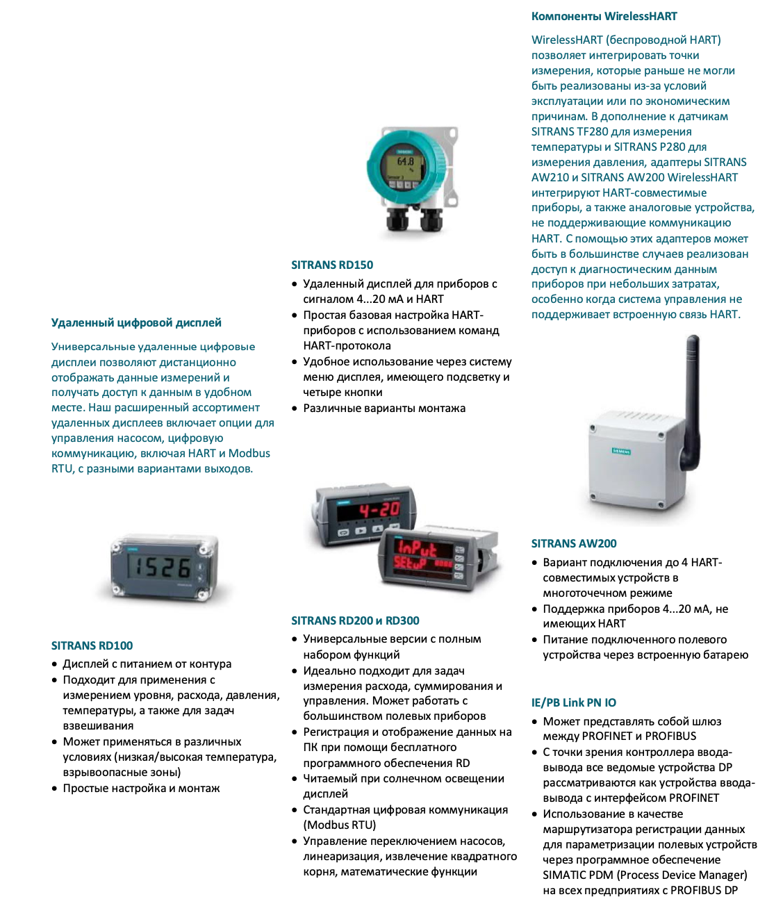 WirelessHART (беспроводной HART)позволяет интегрировать точки измерения, которые раньше не могли быть реализованы из-за условий эксплуатации или по экономическим причинам. В дополнение к датчикамSITRANS TF280 для измерения температуры и SITRANS P280 для измерения давления, адаптеры SITRANS AW210 и SITRANS AW200 WirelessHARTинтегрируют HART-совместимые приборы, а также аналоговые устройства,не поддерживающие коммуникациюHART. С помощью этих адаптеров может быть в большинстве случаев реализован доступ к диагностическим данным приборов при небольших затратах,особенно когда система управления не поддерживает встроенную связь HART.
