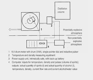 The ethyl alcohol meter has a central computer for processing density and temperature signals and volume-proportional pulses, which are compared with the entered values of the OIMC alcohol table. Example of measuring arrangement |