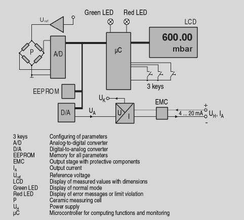 С помощью двух других кнопок осуществляется установка значений в отдельных режимах работы. Для контроля установленного диапазона измерения и состояния над дисплеем расположены 2 СИД. Зеленый СИД сигнализирует, что измеренное давление лежит в границах установленных предельных значений. Красный СИД светится, если измеренное давление лежит за границами установленных предельных значений и в случае ошибки. | ||||||||||||||||||||||||||||||||||||||||||||||||||||||||||||||||||||||||||||||||||||||||||||||||||||||||||||||||||||||||||||||||||||||||||||
