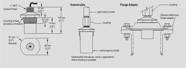 Технические данные Mode of operation | | Measuring principle | Ultrasonic transducer | Input | | Measuring range | 0.3 to 10 m (1 to 33 ft.) | Output | | Frequency | 44 kHz (under normal conditions) | Beam | 12° | Accuracy | | Temperature error | Compensated by integral temperature sensor | Rated operating conditions | | Pressure | Normal atmospheric pressure | Ambient conditions | | | -20 to +60 °C (-5 to +140° F) (CENELEC approved model) -40 to +73 °C (-40 to +163 °F) | Degree of protection | IP68 | Design | | Weight 1) | 1.4 kg (3 lbs) | Supply sources | Siemens Milltronics certified transceiver | Material (enclosure) | Base and lid made of Tefzel® (epoxy fitted joint) 2) | Mounting | 2“ NPT, 2“ BSP or PF2 process connection | Signal transmission | 2-cor shielded/twisted, 0.5 mm2 (20 AWG), PVC sheath | Cable (max. length) | 365 m (1200 ft.) with RG 62 A/U coaxial cable | Options | | | 3" Universal (fits DN 65, PN 10, and 3" ANSI) | | For maintaining high level readings while the transducer is submerged | Certificates and approvals | CE 3), CSA, FM, BASEEFA,/CENELEC, ATEX | 1) Approximate shipping weight of transducer with standard cable length. 2) When measuring chemicals, check compatibility of Tefzel® and epoxy, or mount joint external to process). 3) EMC certificate available on request. |