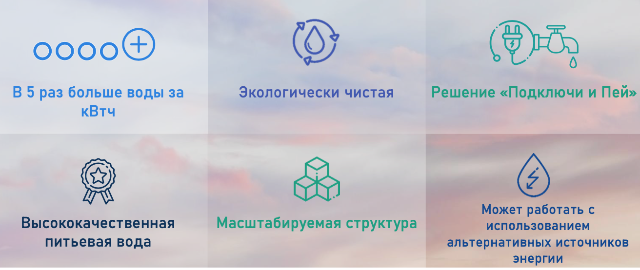 Ежедневно обеспечивает до 900 литров свежей чистой питьевой воды из воздуха.