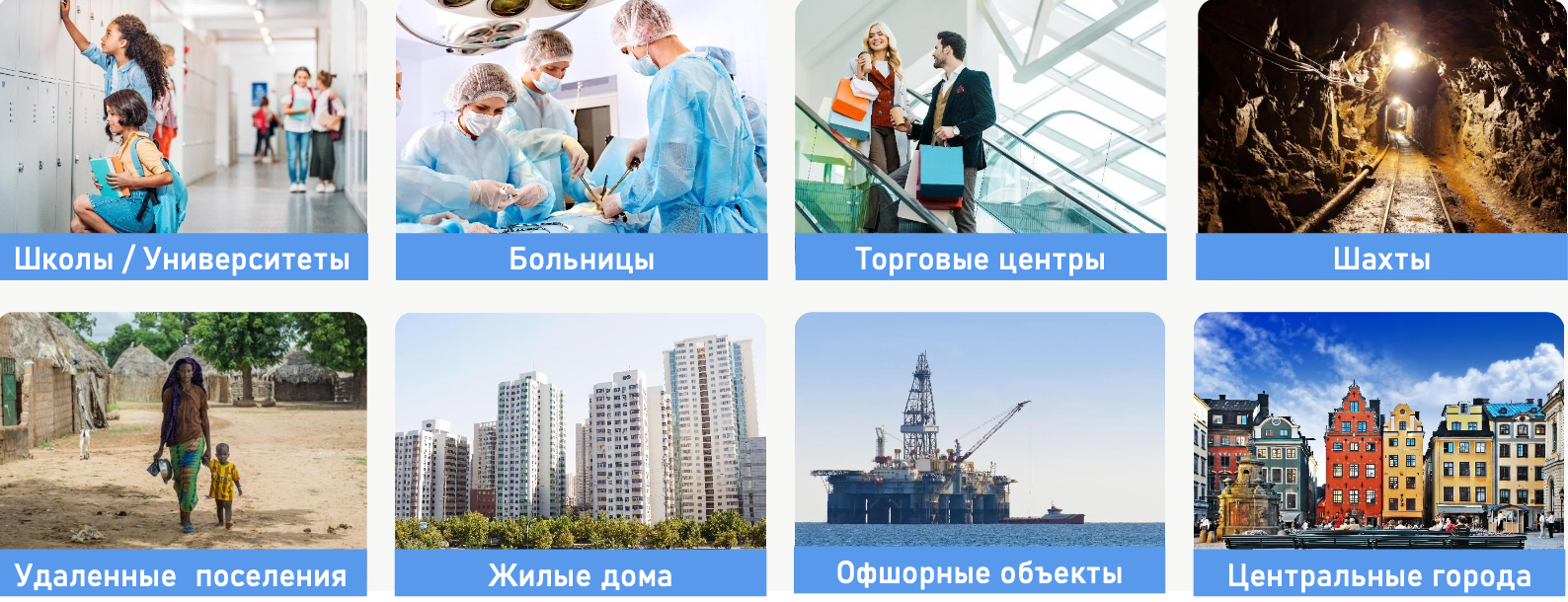 Муниципальные парки, Жилые дома, Маленькие деревни, Временный полевой госпиталь, Сельскохозяйственные фермы, Спасательные операции, Университеты, Школы