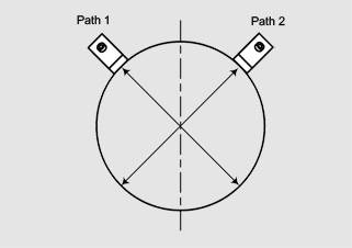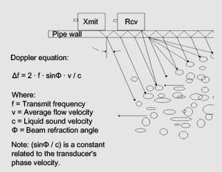 ФункцииOperating PrincipleThe SITRANS FUS1010 system is a transit-time ultrasonic meter that provides exceptional performance using a non-invasive clamp-on approach. Ultrasonic transducers transmit and receive acoustic signals directly though the existing pipe wall, where the fluid refraction angle is governed by Snell’s law of refraction. Clamp-on transducer mounted in a reflect configuration The beam refraction angle is calculated as follows: sin Ө = c / Vφ c = Velocity of sound in fluid VФ = Phase velocity (a constant in the pipe wall) The flowmeter automatically compensates for any change in fluid sound velocity (or beam angle) in response to variations in the average transit-time between transducers A and B. By subtracting the computed fixed times (within the transducers and pipe wall) from the measured average transit-time, the meter can then infer the required transit-time in the fluid (TFluid). The Sound waves traveling in the same direction as flow (TA,B) arrive earlier than sound waves traveling against the direction of flow (TB,A). This time difference (Δt) is used to compute the line integrated flow velocity (v) as shown in the equation below: v = VФ / 2 · Δt / TFluid Once the raw flow velocity is determined, the fluid Reynolds number (Re) must be determined to properly correct for fully developed flow profile. This requires the entry of the fluid’s kinematic viscosity (visc) as shown in the equations below, where Q represents the final flow profile compensated volumetric flow rate. Re = Di · vФ / visc Q = K(Re) · ( π / 4 ·Di2 ) · vФ v = Flow velocity visc = μ / ρ = (dynamic viscosity / density) K(Re) = Reynold flow profile compensation In all wetted type ultrasonic flowmeters the meter constants are configured prior to leaving the factory. As this is not possible with clamp-on meters, the settings must be made by the customer at the time of installation. These settings include pipe diameter, wall thickness, liquid viscosity, etc. SITRANS Clamp-On meters that include temperature sensing can be configured to dynamically infer changes in fluid viscosity for the purpose of computing the most accurate flow profile compensation (KRe). Ultrasonic Transducer Types Two basic types of Clamp-On transducers can be selected for use with the SITRANS FUS1010 flowmeter. The lower cost “universal” transducer is the most common type in the industry and is suitable for most single liquid application where the sound velocity does not vary much. This transducer type can be used on any sonically conductive pipe material (including steel) making it well suited for portable survey applications. Universal transducers are selected based on the pipe diameter range alone, so wall thickness is not important to the selection process. The second transducer type is the patented WideBeam transducer (called high precision), which utilizes the pipe wall as a kind of loudspeaker to optimize the signal to noise ratio and provide a wider area of vibration. This makes this kind of transducer less sensitive to any change in the fluid medium. The WideBeam transducer is designed for steel pipes, but can also be used with aluminum, titanium and plastic pipe. It is the preferred transducer for HPI and gas applications. Note that unlike the universal type, this transducer selection is dependent only on the pipe’s wall thickness. Automatic Zero Drift Correction (ZeroMatic Path™) When WideBeam transducers are installed in the “Reflect” mode configuration shown below, the acoustic signal travels in two different paths between transducers A and B. One path “ACB” travels through the pipe wall and fluid, while the other path “AB” never enters the fluid medium. This later path provides the meter with a reference signal that is completely independent of flow rate and can therefore be used as a measure of transducer “mis-match”. By continually analyzing this pipe wall signal the FUS 1010 meter can dynamically correct for flow errors caused by zero drift. Multi-Channel Flowmeters For improved flow profile averaging, redundancy, or better cost per measurement, Clamp-On meters can be supplied with 1 or 2 measurement channel, with 4 channel meters supplied as special order. In the standard FUS, FUP, FUE systems, these channels can be installed on separate independent lines or in a multi-beam installation as shown below. This choice is made during meter setup, where either a multi-beam (two beams on same pipe) or multi-channel installation can be selected. Dual Beam installation example Doppler (Reflexor®) Operation The Doppler measurement technique relies on the reflection of sound energy off tiny gas bubbles or suspended particles to create a doppler shift in the fixed frequency acoustic transmit signal, as shown below. When de-demodulated using FFT signal processing, this doppler shifted frequency (Δf) can be used to measure the flow rate as described in the associated doppler equations below. Although the standard transit-time measurement system is very tolerant of high levels of liquid aeration and high solids content, there will be cases where insufficient signal will be available for operation with transit-time mode. For these cases the FUS, FUP and FUE meters can be ordered with this optional doppler capability, which requires an additional doppler transducer. SITRANS meter family descriptionSITRANS FUS1010 flowmeters The FUS1010 system is a basic function permanent (or dedicated) clamp-on meter that is available with a full range of safety approvals, I/Os and enclosure types. This meter can be used in a wide range of applications but does not include the special functions found in the hydrocarbon FUH and energy FUE flowmeters. The FUS1010 meter is typically programmed with a fixed viscosity and specific gravity entry, which can limit the mass flow and volumetric flow accuracy when highly variable (multi-product) liquid properties flow through the same pipeline. If this me
